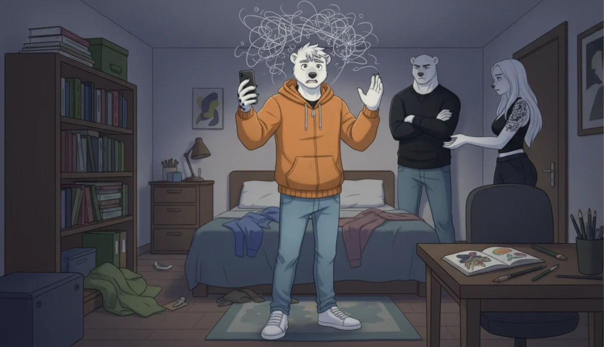 Um jovem impulsivo, criativo e energético, mas marcado por conflitos internos. O TDAH dificulta organização, foco e rotina. O bipolar traz altos e baixos que ele tenta “regular” com maconha — que dá alívio momentâneo, mas mascara o problema real. Cresceu entre cobrança do pai e acolhimento da mãe. Busca liberdade, mas teme decepcionar.